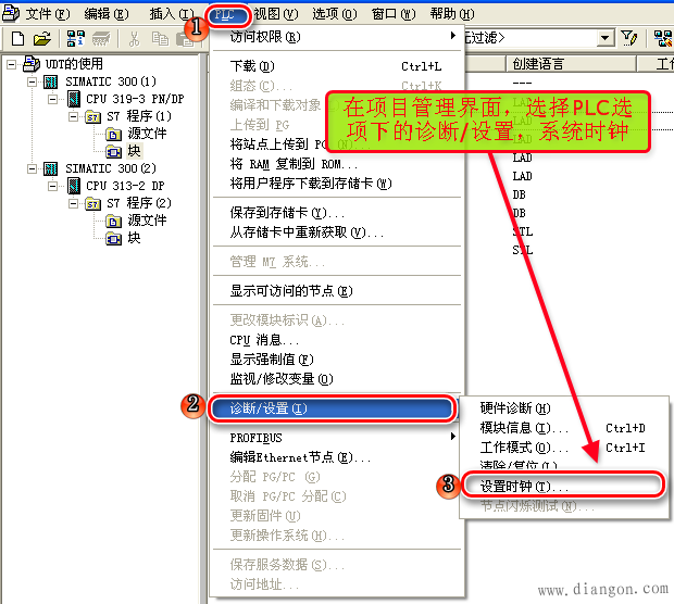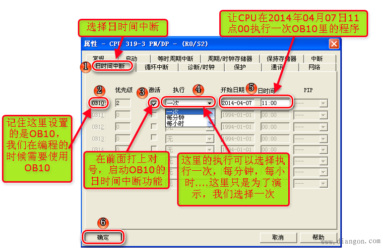 日时间中断: 打开硬件组态中CPU的属性设置对话框