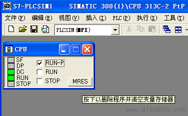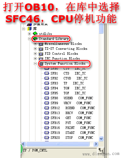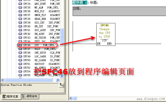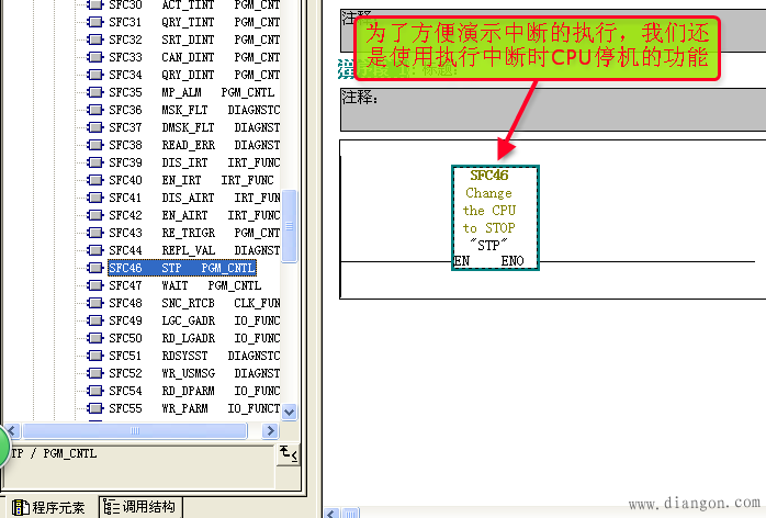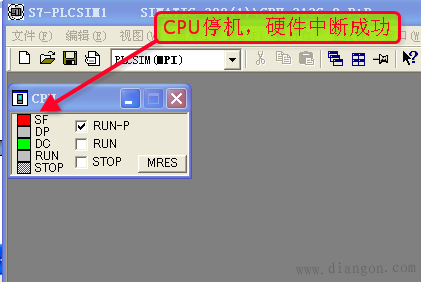 下面我们在OB10中编写需要中断执行的程序,因为是做演示,我们就让CPU在执行OB10的时候停机,这样更清晰可见;