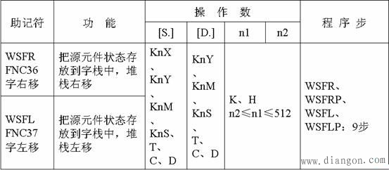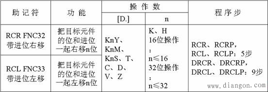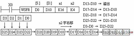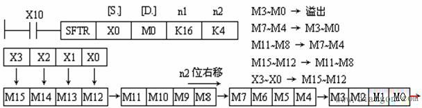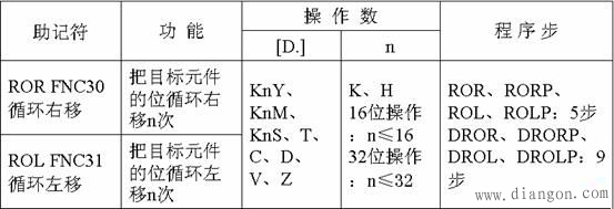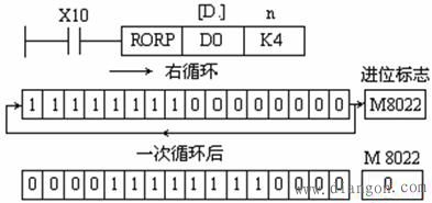 三菱PLC循环移位与移位指令 右循环移位指令ROR、左循环移位指令ROL 带进位循环右移指令RCR、带进位循环左移指令RCL 位右移位指令SFTR、位左位指令SFTL 字右移位指令WSFR、字左移位指令WSFL 先入先出(FIFO)写入指令SFWR、读出指令SFRD 1、右循环移位指令ROR、左循环移位指令ROL 2、带进位循环右移指令RCR、带进位循环左移指令RCL 执行RCR、RCL指令时,各位的数据与进位位M8022一起(16位指令时一共17位)向右(或向左)循环移动n位。在循环中移出的位送入进位标志,后者又被送回到目标操作元件的另一端。 ![]() 4、字右移位指令WSFR、字左移位指令WSFL