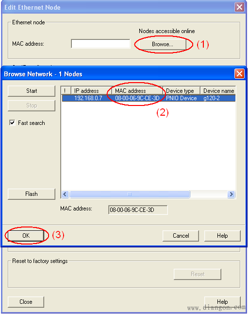 然后,根据图3中的顺序,为变频器设置IP地址,子网掩码(设置后,点击“Assign IP Configuration”按钮分配),设备名称(必须以字母开头,设置后,点击“Assign Name”按钮分配),点击“Close”按钮关闭对话框。
