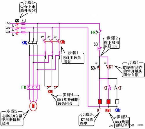 (a)自耦变压器降压启动控制工作原理示意图1 (b)自耦变压器降压启动控制工作原理示意图2 |