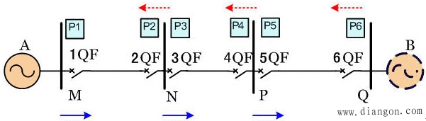 正方向故障时方向电流保护才可能动作,按正方向分组,图中的保护可以分为两组:P1、P3、P5为一组,整定动作电流时考虑A侧电源提供的短路电流;P2、P4、P6为另一组,整定时考虑B侧电源提供的短路电流。 |