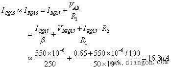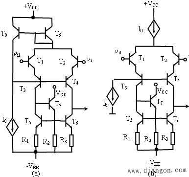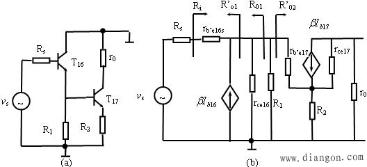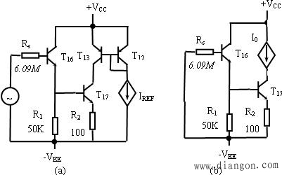 图1 负载开路时 既要保证集电极的动态电阻足够大,又要保证静态工作点稳定的惟一方法是选择恒流源(有源)负载。 [例1]图2(a)是uA741运放电路中间级放大电路的简化电路图。设三极管的放大倍数