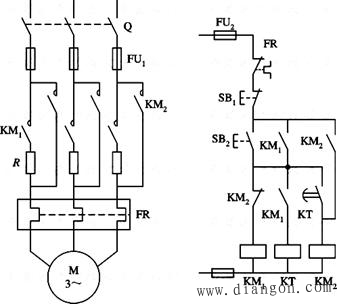 合上Q,按下SB2,KM1线圈得电自保,其常开主触点闭合,电动机M串电阻R启动,且使时间继电器KT线圈得电。当到达KT的整定时间时(此时M的转速接近额定转速),其常开延时触点闭合,KM2线圈得电自保,KM2的常闭辅助触点先打开,使KM1线圈失电,进而使KT线圈失电,由于常开主触点KM2闭合,将R短接,M全压运转。