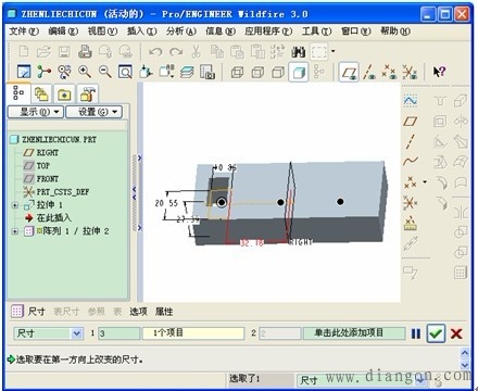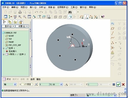 | (2)尺寸阵列:基本步骤,(1)选择需要阵列的实体,单击阵列工具,在弹出的操控板中选择“尺寸”。(2)选择阵列方向的尺寸数值,系统自动弹出修改增量数值的提示,据需要修改其值,(增量数值时阵列后每个实体之间的距离),输入阵列数值,确定方向,单击“确定”如图5。(阵列的方向可以用增量数值的正与负规定)(3)结果如图6。 | |||||||||||||||||||||||||||||||||||