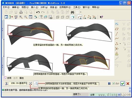 PRO/E所提供的编辑命令功能强大,不但能对实体进行编辑,也可对曲面进行编辑;主要包括镜像、阵列、复制、合并、剪切,五种类型。 1.镜像功能:基本步骤 | |||||||||||||||||||||||||||||||||||