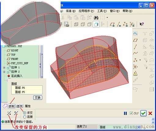 | 3.曲面合并功能:选择前面建立的两个曲面,单击“合并”按钮 | |||||||||||||||||||||||||||||||||||