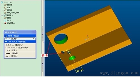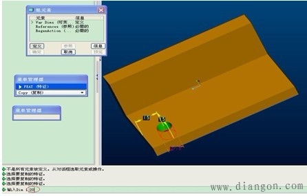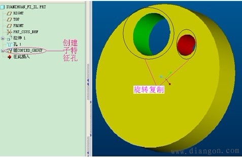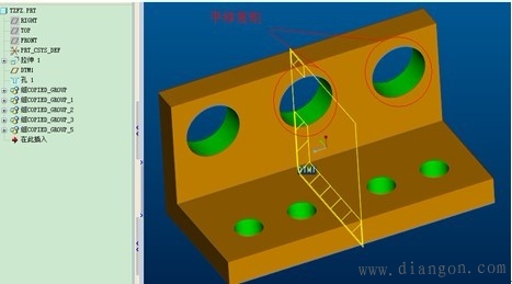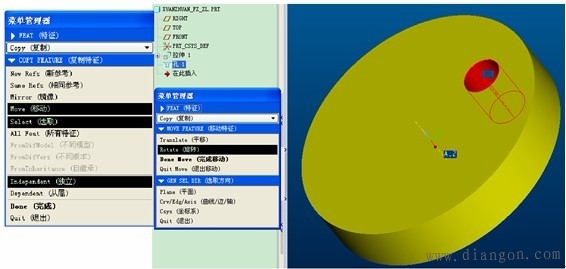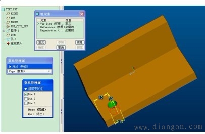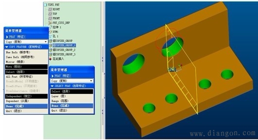 | 特征复制的定义形成相似的父子特征,但是每次只能产生一个特征。 特征复制的类型:包括独立型和从属型。独立型是指:父子特征互相独立,即修改父特征的截面或尺寸时,子特征不会作相应的变化,反之亦然。从属型是指:父子特征互相关联,即修改父特征的截面或尺寸时,子特征会作相应的变化,反之亦然。 特征复制的方式包括:新参考、相同参考、镜像和移动。新参考是指:可以在不同平面上产生复制特征。相同参考:可以快速产生相同方向的复制特征。镜像是指:必须指定镜像平面,而且产生尺寸大小,形状完全一样的父子特征。移动包括平移和旋转,平移必须指定平移方向和距离,选择“平面”项,旋转必须指定旋转方向和角度,选择“曲线/边”项。 “组可变尺寸”的含义:指用于通过修改父特征的尺寸,从而产生大小不同的子特征,当用户将鼠标停留在某选项时,主窗口相应的尺寸就以红色显亮显示,便于用户选取尺寸。 | |||||||||||||||||||||||||||||||||||