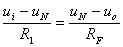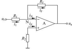 对于图1(b),由于理想运放的经输入电流为零,所以ip=in=0,由于运放的同相和反相输入端“虚短路 ”,反相输入端(标注“N”处)电位近似为0,所以up=un=0。 节点N的电流方程为i1=iF