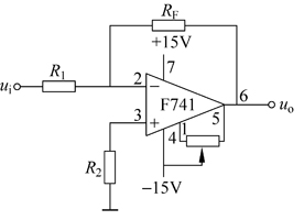 1、反相比例运算电路 在反相比例运算电路中,电路输入信号ui总是经过一个电阻R1接到反相输入端,输出信号uo经过一个电阻RF反馈到反相输入端,如图1(a)所示。由图可见,图中电路是一个用国产芯片F741接成的反相比例运算电路,图中同时给出了电源连接及调零电路,并在同相输入端对地串了一个电阻R2=R1//RF,目的是使两个输入端对地的等效电阻相同。需要强调的是,今后除特殊情况外,电源及调零等电路均为默认,不再画出,从而图1(a)所示电路简化为图1(b)所示。