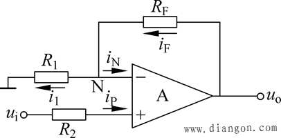 由于理想集成运放的净输入电流为零,www.dgdqw.com所以ip=in=0,所以up=ui,且i1=iF,即