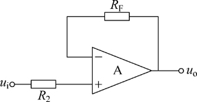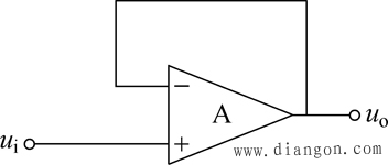 上式表明,输出电压与输入电压成比例运算关系而且相同。电阻R2是平衡电阻,R2=R1//RF。同相比例运算电路的输入电阻为无穷大。 由式(7),如果使R1=∞且RF=0,电路就变成了图3或图4所示,这时的电压放大倍数Auf=1,即uo=ui,电路的输出电压和输入电压相同,这样的电路称为电压跟随器。