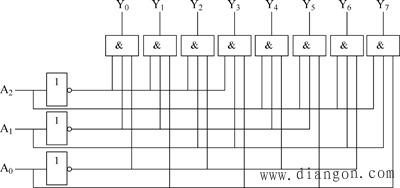 根据逻辑函数式可以画出3-8线译码器的逻辑电路,如图2所示。