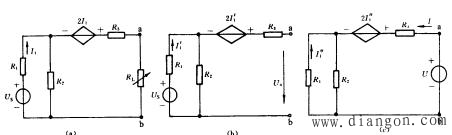 解:对于图(a)所示电路,我们可采用叠加原理来求其开路电压Uo 将图(a)电路化为无源二端网络后如图(b)所示,求其等效内阻