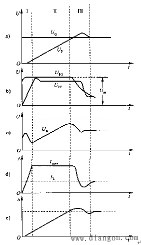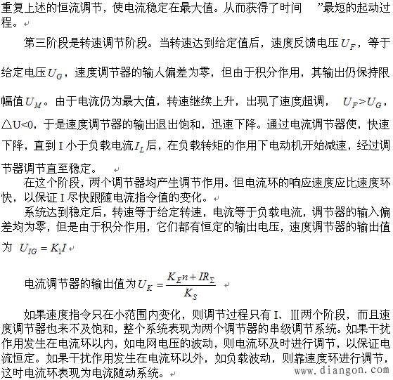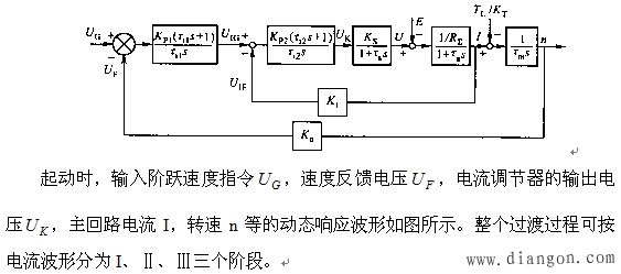 通过起动的动态过程分析,可清楚地了解速度调节器及电流调节器是如何起调节作用的,若调节器参数选配得当,便可得到近似理想的过渡过程。