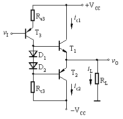 利用图1所示的偏置电路是克服交越失真的一种方法。由图可见,T3组成前置放大级(注意,图中未画出T3的偏置电路),T1和T2组成互补输出级。静态时,在D1、D2上产生的压降为T1、T2提供了一个适当的偏压,使之处于微导通状态。由于电路对称,静态时iC1= iC2 ,iL= 0, vo =0。有信号时,由于电路工作在甲乙类,即使vi很小(D1和D2的交流电阻也小),基本上可线性地进行放大。 上述偏置方法的缺点是,其偏置电压不易调整,改进方法可采用VBE扩展电路。