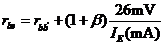 式中rbb’是晶体管基区电阻,在小电流(IEQ约为几毫安)工作情况下,约为80Ω左右,26mV为温度的电压当量,在室温(300K)时的值。应当注意的是,上式的适用范围为0.1mA<IE<5mA,实验表明,超越此范围,将带来较大的误差。。 从上式可看出,rbe与静态电流IE有关。值得注意的是,rbe是三极管b、e之间的交流等效电阻,而不是直流电阻。 |