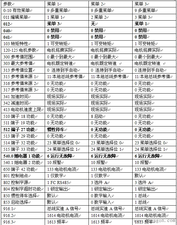 辑完各个菜单后,请将011编辑菜单改为改为9 有效菜单。 注意事项: 1: 变频器由现场就地,远程总线,停止三种状态,通过现场转换开关进行切换,变频器的32,33端子进行菜单切换。停止是菜单1,现场就地是菜单2,远程总线是菜单3。 2: 变频器正常工作时在AUTO ON状态(按一下AUTO ON 即可),否则变频器无法正常运行。变频器出现重要故障,按复位键复位后,变频器会在OFF状态,此时应按到AUTO ON 上来。 3: 若想在变频器面板上强制停止变频器,可按面板的OFF键。 4: 注意参数1-06,此参数应当默认为normal,电机出现反转时请更改电机接线,不建议使用此功能更改电机转向,防止在进行初始化后,电机出现反转 5: 将Profibus总线卡的地址拨到和上位机软件配置相同(二进制数,具体地址由客户中控室提供)。 6: 变频器初始化断电同时按Status+MainMenu+OK三键,上电停留5秒即可,此时会有报警提示,按RESET即可。 7:参数及菜单复制功能,0-50设定为【1】所有参数到LCP,后将面板取下至另一台变频器,将0-50设定为【2】从LCP传所有参数,复制后请检查重要参数,不可进行不同功率复制。 8:面板显示功能,面板可同时看到五项数据,具体为那项数据可通过0-20、0-21、0-22、0-23、0-24进行更改。 9: 若通过预制参考值试用电机,请在通讯完成后将其更改为0,防止通讯调频的叠加,此种方式不推荐使用 10: 若变频器上面有警告信息,如总线通讯故障,此时需将继电器1设定为5运行,而不是运行无警告才可运行变频器,在初次调试时均设定为5运行,正式投产后请将其全部更改为6运行/无警告 11:假如变频器出现故障,在使用菜单3进行总线控制的时候,变频器面板进行复位以后,可能会出现控制字一直下发,所以DCS应当具备变频器故障,启动控制字自动丢失的条件,或者按照操作规范,出现问题停机先点停止! 12:因为OFF和HAND ON已经禁用,所以变频器不能使用面板上的OFF进行停止,如果想使用必须先将此键解锁,禁用OFF以后如果在使用远程菜单并且不能通过DP通信变频器停止变频器时,会出现安全隐患,因此增加参数表中的0-12和5-12参数,使得可以在远程操作的情况下通过转换开关停止变频器。 因为调试时不能为用户设置9——12条注意事项参数,与用户进行沟通后由用户进行进行以上参数的更改,希望注意在通信完成后进行相关参数的更改,以便可以正常、安全的使用变频器,因为未更改以上参数出现的问题,概不负责!