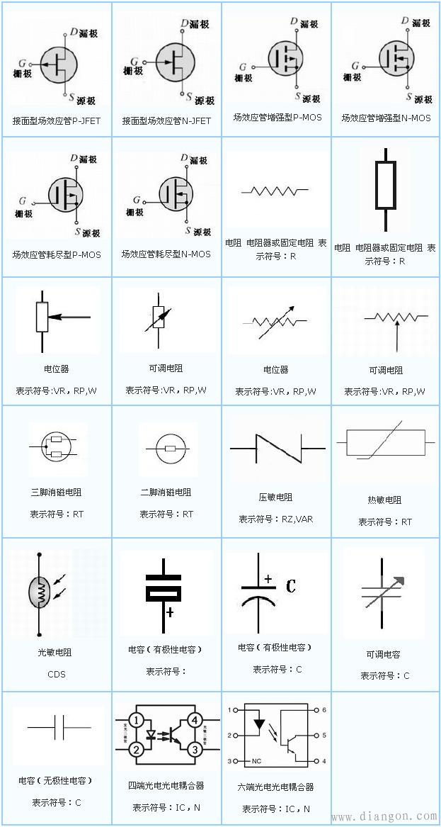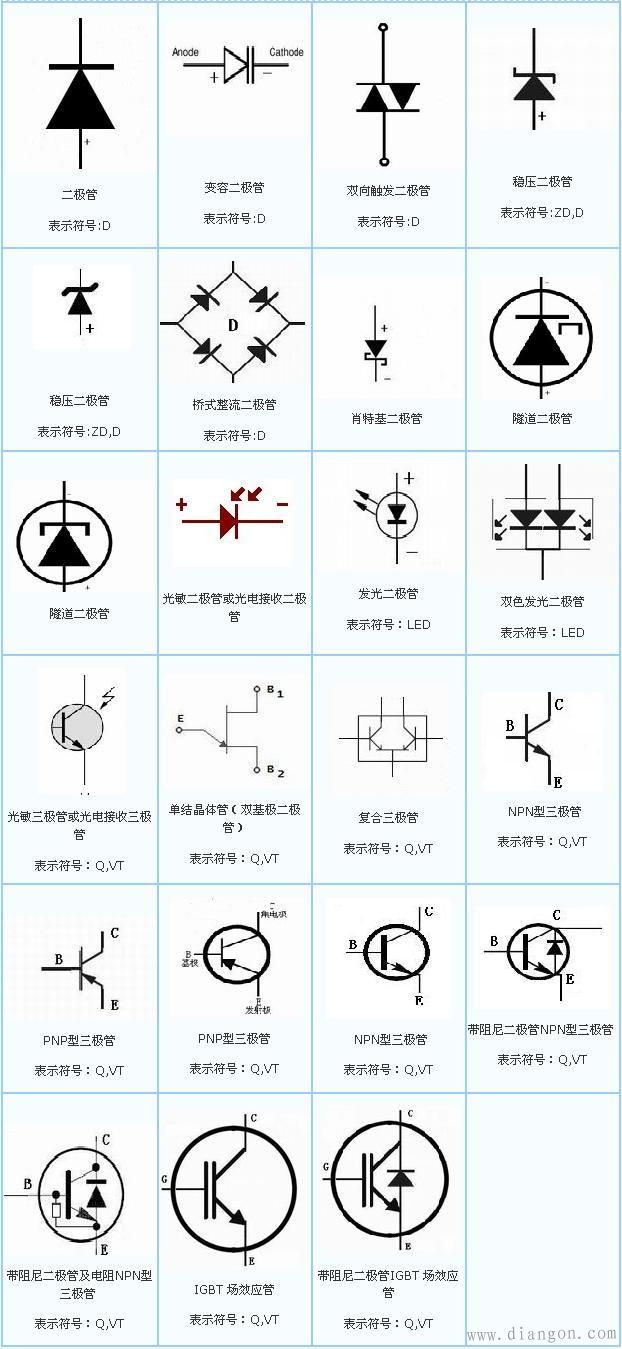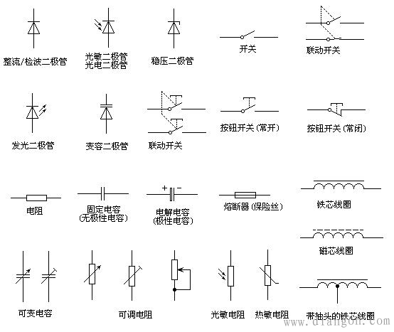 常用电子元器件符号及字母表示大全 电流表 PA 电压表 PV 有功电度表 PJ 无功电度表 PJR 频率表 PF 相位表 PPA 最大需量表(负荷监控仪) PM 功率因数表 PPF 有功功率表 PW 无功功率表 PR 无功电流表 PAR 声信号 HA 光信号 HS 指示灯 HL 红色灯 HR 绿色灯 HG 黄色灯 HY 蓝色灯 HB 白色灯 HW 连接片 XB 插头 XP 插座 XS 端子板 XT 电线,电缆,母线 W 直流母线 WB 插接式(馈电)母线 WIB 电力分支线 WP 照明分支线 WL 应急照明分支线 WE 电力干线 WPM 照明干线 WLM 应急照明干线 WEM 滑触线 WT 合闸小母线 WCL 控制小母线 WC 信号小母线 WS 闪光小母线 WF 事故音响小母线 WFS 预告音响小母线 WPS 电压小母线 WV 事故照明小母线 WELM 避雷器 F 熔断器 FU 快速熔断器 FTF 跌落式熔断器 FF 限压保护器件 FV 电容器 C 电力电容器 CE 正转按钮 SBF 反转按钮 SBR 停止按钮 SBS 紧急按钮 SBE 试验按钮 SBT 复位按钮 SR 限位开关 SQ 接近开关 SQP 手动控制开关 SH 时间控制开关 SK 液位控制开关 SL 湿度控制开关 SM 压力控制开关 SP 速度控制开关 SS 温度控制开关,辅助开关 ST 电压表切换开关 SV 电流表切换开关 SA 整流器 U 可控硅整流器 UR 控制电路有电源的整流器 VC 变频器 UF 变流器 UC 逆变器 UI 电动机 M 异步电动机 MA 同步电动机 MS 直流电动机 MD 绕线转子感应电动机 MW 鼠笼型电动机 MC 电动阀 YM 电磁阀 YV 防火阀 YF 排烟阀 YS 电磁锁 YL 跳闸线圈 YT 合闸线圈 YC 气动执行器 YPA,YA 电动执行器 YE 发热器件(电加热) FH 照明灯(发光器件) EL 空气调节器 EV 电加热器加热元件 EE 感应线圈,电抗器 L 励磁线圈 LF 消弧线圈 LA 滤波电容器 LL 电阻器,变阻器 R 电位器 RP 热敏电阻 RT 光敏电阻 RL 压敏电阻 RPS 接地电阻 RG 放电电阻 RD 启动变阻器 RS 频敏变阻器 RF 限流电阻器 RC 光电池,热电传感器 B 压力变换器 BP 温度变换器 BT 速度变换器 BV 时间测量传感器 BT1、BK 液位测量传感器 BL 温度测量传感器 BH、BM 电子元件符号综合表-1 |