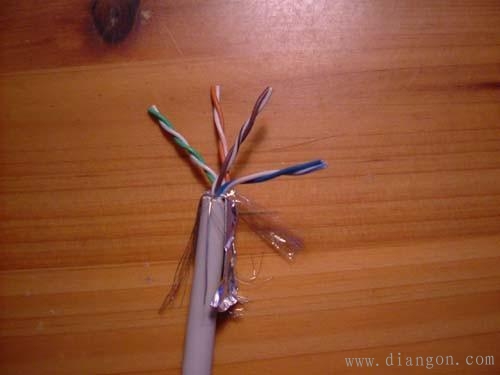 下面开始打线了,首先还是先把网线的外皮剥掉,这次可以剥得长点儿,便于后面打线。露出了四组双绞线:
