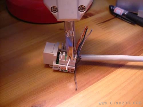 下面开始打线,用工具压住模块和线,用力压下去,将线卡在模块里面,并把多余的先头剪掉。