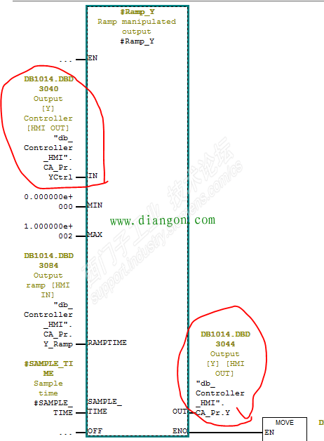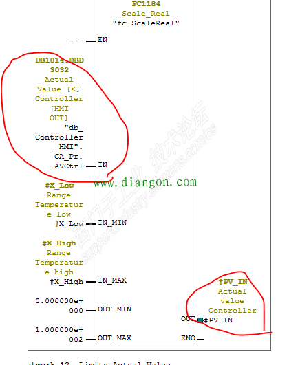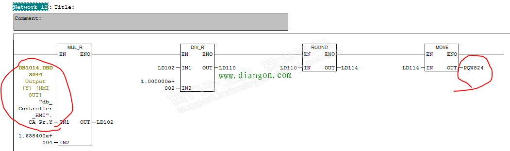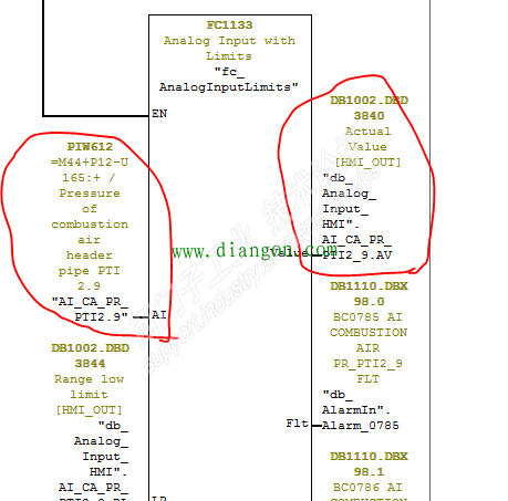 故障现象:G150变频器转速异常波动,制动电阻产生高温,有异常的烧糊味! 处理过程:半夜接到电话说G150变频器转速异常波动,制动电阻产生高温,有异常的烧糊味! 现场人员微信发视屏给我,屏幕上的SPEED从1500到300在变化,看到此现象,第一时间要停机,我告诉现场人员变频器是通过PID控制的,首先我们要确认变频器有没有问题,可以不通过PID进行测试变频器是否有问题,制动电阻产生高温肯定是加减速频繁引起的。 我查看了下程序,变频器的控制字是PQW824,PQW824由DB1014.DBD3044通过转换传送