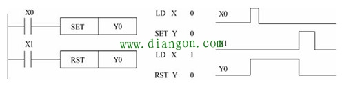 SET(置位指令),使操作保持ON的指令。 RST(复位指令) 使被操作的目标元件复位并保持清零状态。 SET、RST指令的使用如图所示。