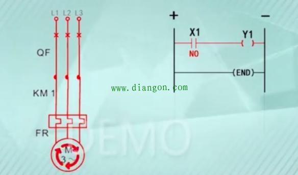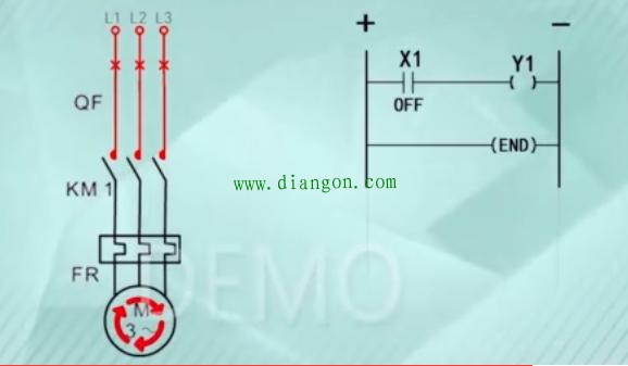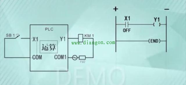 常开按钮SB1接到PLC的输入点X1,当我们把SB1按钮按下输入回路就接通了,X1就得到一个IO信号,X1的IO信号送到PLC内部进行运算,就输出一个信号,输出的信号Y1将输出回路接通,KM1线圈得电,对应的主电路中的KM主触点就吸合了,我们再看下面这个图,如图6: