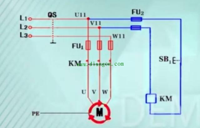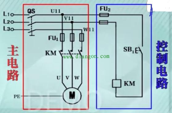 这个是一个传统的控制电路,我们这个电路它分为:主电路和控制电路两部分。 1、主电路有:QS(断路器)、FU(熔断器)、KM(接触器主触点)M(电动机)所组成。2、控制电路(也称为辅助电路):由FU(熔断器)、SB(常开触点)、KM(接触器线圈)构成。大家:再看下面这个图,如图3: