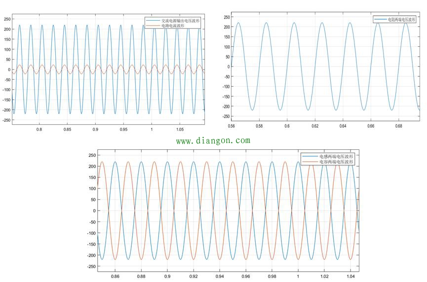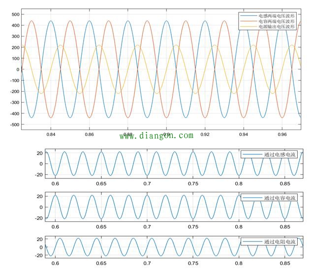 为了更加深入了解并联谐振的现象,在matlab/simulink中搭建交流并联R、L、C电路。设置交流电源幅值为220V,频率为50Hz,电阻为10欧姆,根据并联电路发生谐振的条件,设置L为 0.0318H,dgdqw.com C为3.1831e-04F,仿真结果下图所示。