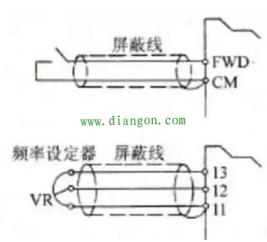 7)屏蔽线的接线,如下图所示。把一端连接到各自的共用端子(11、CM)上,另一端不接。