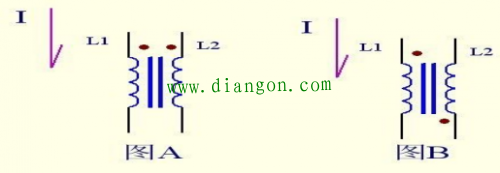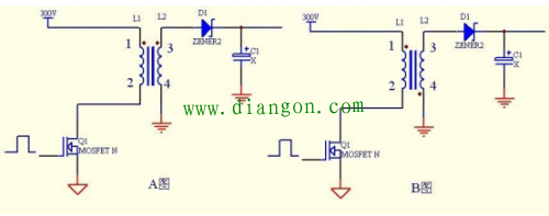 (图三) 图三,一眼便看出就是点不同。当图 A 里 L1 有电流 I 流入时自身产生上+下 - 感应电动势。同时在图 AL2 里也产生一个上+下 - 的电动势。当然这两个电感线圈必须在同一个磁芯(同 一个磁路)上才可以的。在图 B 里的 L2 就产生一个方向相反的感应电动势。(在图中我们 定义为 L1 是初级线圈,L2 是次级线圈)。 那么这个感应电动势的同方向和反方向是怎样形成的?这个 简单了,这个是在生产变压 器来决定的。和流入电流的电感在绕线时方向相同就可以在起始脚产生相同的电动势了。输出整流二极管决定的是正激和反激。如果你初级绕组是从变压器的一脚顺时针结束到二 脚,次级绕组从三脚顺时针结束于四脚,如果你的输出整流二极管接在了变压器的 3 脚变压器的四角接地,,这个叫正激,如果你的输出二极管接在了变压器的 4 脚,变压器的三脚接 地那么就是反激如下图四:A 图是正激 B 图是反激。