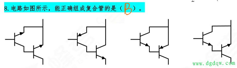 学三极管的时候,“达林顿管”这个词大家肯定都不陌生,它其实就是由两个三极管按照特定方式组合成的一个复合三极管。最近有网友刷题碰到了关于达林顿管组合方式的题目,还问哪个选项是正确的。下面咱们就好好唠唠这事儿。 要判断复合管组合是否正确,得遵循两个关键原则:一是电流要能连续流通,二是各三极管都得工作在放大区。具体来说,就是前一个三极管的集电极或者发射极电流,得能作为后一个三极管的基极电流,而且每个三极管都要满足发射结正偏、集电结反偏的条件。 咱们来看看四个选项中的选项C,它不满足要求主要有俩原因。其一,电流流向冲突。正常情况下,复合管前管的发射极电流方向得和后管基极所需的电流方向匹配,这样才能给后管提供正常的基极驱动电流,让后管进入放大区。可选项C里,这电流流向根本不搭,后管得不到合适的驱动电流,自然就没法正常工作。其二,偏置状态错误。选项C的连接方式,会让其中一只三极管的发射结反偏,这完全违背了三极管放大的偏置要求,整个复合管也就没法实现电流放大的功能。简单讲,选项C的管脚连接方式,让三极管之间的电流没法正常传递,不符合复合管的组成规则。 我记得学复合管知识的时候,老师教过一个判断正确组成的口诀,记住这个口诀,这类题目就能快速判断啦。 第一点是“电流要顺流”。前管输出的电流方向,得和后管基极输入的电流方向一致,这样才能形成连续的电流通路。就好比水流得顺着河道走,电流也得顺着正确的方向流,才能让复合管正常工作。 第二点是“结偏要正确”。每只三极管都得满足发射结正偏、集电结反偏的放大偏置条件。这就像给机器上润滑油,只有各个部件都处于合适的状态,机器才能高效运转,三极管也是如此,偏置对了才能放大电流。 第三点是“类型要适配”。同类型(NPN和NPN复合、PNP和PNP复合)或者互补型(NPN和PNP复合)三极管组合时,管脚连接得对应电流流向。不同类型的三极管就像不同规格的零件,得按正确的方式组装,才能发挥出应有的作用。 第四点是“复合管的类型取决于最右侧的第一个三极管的类型”。比如说两个三极管NPN与PNP复合后,这个复合管就是PNP型的。 结合这个口诀再看选项C,就是因为它电流流向逆流,还让三极管发射结反偏,所以根本没法组成合格的复合管。 复合管可厉害啦,它能大大提高三极管的放大倍数,有“一加一大于二”的效果,在一些电子电路里经常能用得到,像串联稳压电路,它的调整管用的就是复合管。