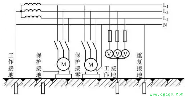 你是否有过这样的困惑:明明都是“接地”,为什么有的接大地,有的接零线?为什么农村用电和城市用电的“保命措施”完全不同?更可怕的是,一旦用错,原本安全的设备可能瞬间变成“电老虎”!今天咱们就用大白话,把工作接地、保护接地、保护接零、重复接地这四个核心概念彻底讲透,看完绝对让你恍然大悟! 一、工作接地 先想个问题:为什么家里的220V电压能稳定存在?答案就藏在“工作接地”里。 简单说,工作接地就是给整个电网找个“零电位参考点”。通常是把变压器或发电机的中性点,用金属导体牢牢接在大地里。这么做有两个关键作用: 1.稳电压:所有用电设备的电压都是相对这个“零点”测量的,就像海平面是测量山峰高度的基准一样。 2.保设备:雷击或高压窜入低压时,电流能通过接地装置快速泄入大地,避免设备被烧毁。 3.举个例子:打雷时,如果没有工作接地,雷电可能顺着电线窜进你家,烧坏电视、冰箱;有了它,电流会优先通过接地线跑掉,设备就安全了。 4.注意:工作接地是所有配电系统(TT/TN/IT)的“标配”,但它的目的不是防触电,而是让系统能正常工作! 二、保护接地 如果设备漏电,外壳带电怎么办?这时候就需要“保护接地”登场了。 2.适用场景:主要用在IT系统(如医院手术室)和TT系统(农村、户外临时用电)。 3.为什么农村常用?:因为农村电网中性点不接地(TT系统),如果设备漏电,外壳电压会很高,保护接地能大幅降低触电风险。 4.关键提醒:保护接地需要接地电阻足够小(通常≤4Ω),否则电流太小,保护装置可能不动作! 三、保护接零 城市里几乎所有小区、商场用的都是“保护接零”,它的原理是把设备外壳直接接在供电系统的零线上! 一旦漏电,外壳和零线之间会形成单相短路,电流瞬间飙升到几百安,断路器会立刻跳闸断电。 举个例子:你家的电热水器如果漏电,保护接零能让断路器在0.1秒内切断电源,根本来不及触电。 适用场景:仅限TN系统(包括TN-C、TN-S、TN-C-S),也是国内城市电网的主流方式。 致命禁忌:保护接零和保护接地绝对不能混用!否则一台设备漏电,所有接零的设备外壳都会带电,后果不堪设想! 四、重复接地 在TN系统里,光靠保护接零还不够,还得加上“重复接地”。 它是在零线的干线末端、分支处等多点再接一次大地。这么做有两个作用: 1.防断线:如果零线断了,重复接地能让断点后的设备外壳电压从“相电压”(220V)降到“部分电压”(比如110V),大幅降低触电风险。 2.加速跳闸:单相接地故障时,重复接地能增大故障电流,让保护装置更快动作。 3.举个例子:小区里的零线如果被挖断,没有重复接地的话,所有接零的设备外壳都会带220V电;有了它,电压可能降到几十伏,危险性大大降低。 一句话记住四个概念 1.工作接地:给电网找“零点”,稳电压、保设备。 2.保护接地:设备外壳接大地,农村/户外保命用。 3.保护接零:设备外壳接零线,城市电网主流保命法。 4.重复接地:TN系统里零线多点接地,给保护接零加保险。